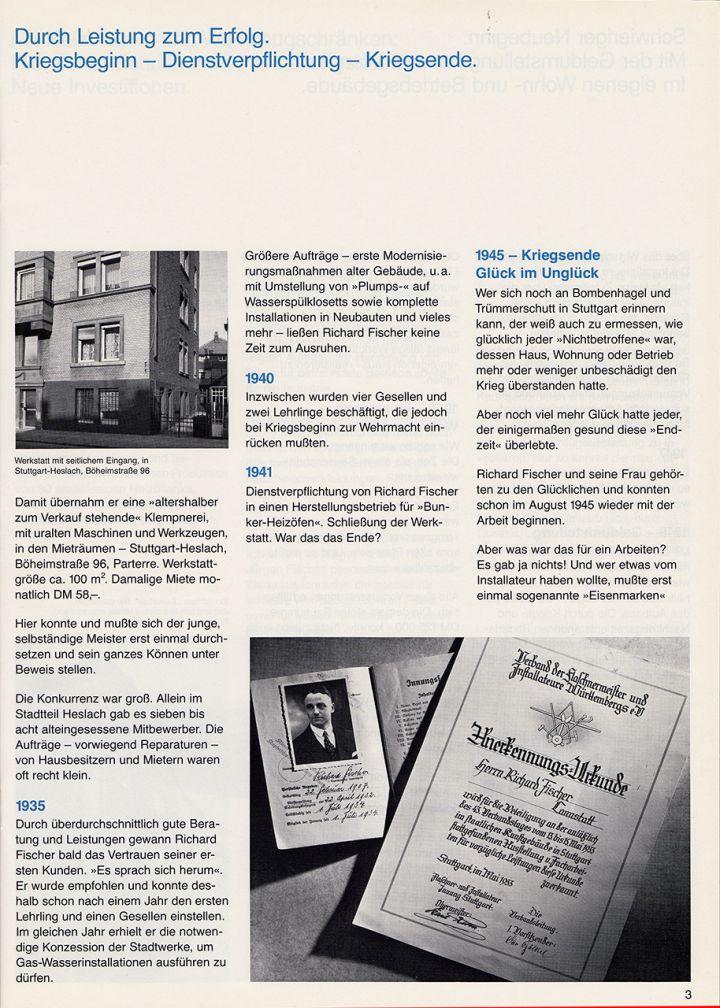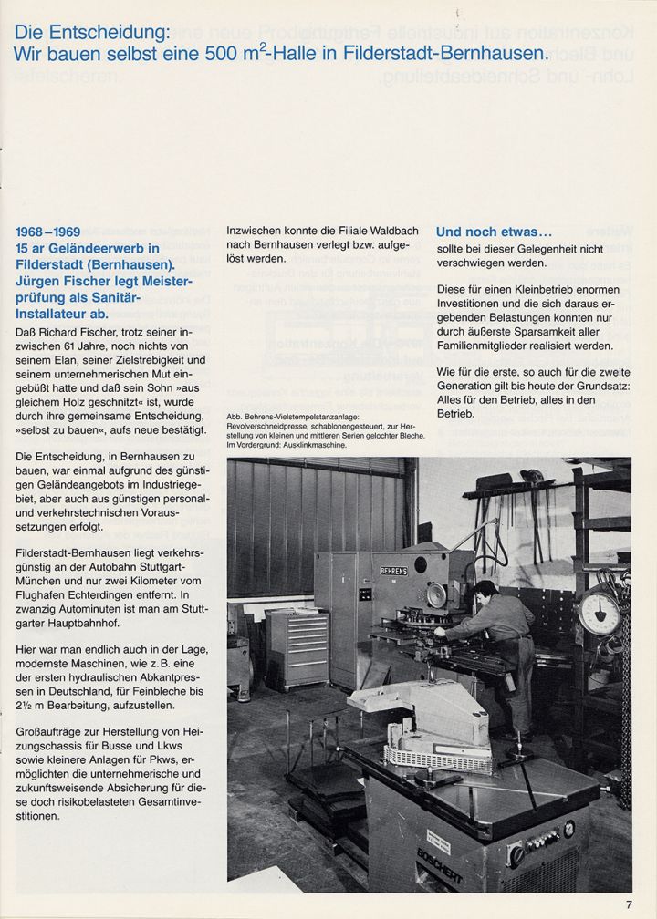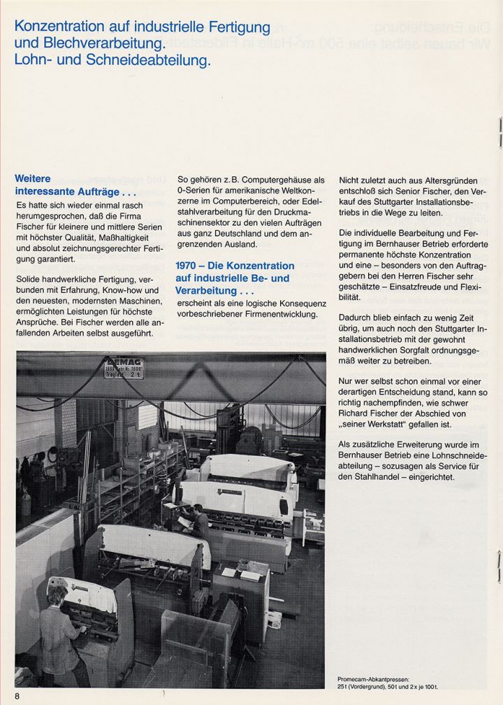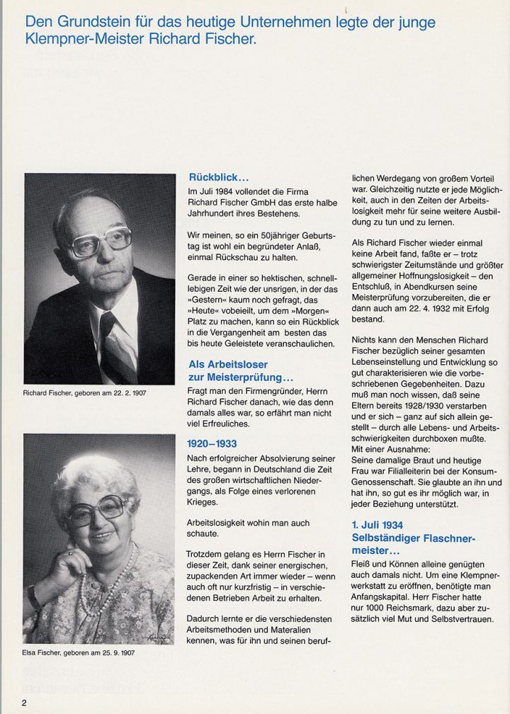 Im Jahr 1934 gründete Flaschnermeister Herr Richard Fischer (1907-1993) die Firma in Stuttgart Heslach. In den Anfangsjahren blieb Richard Fischer seinem erlernten Berufsbild treu. Nach einiger Zeit begann das noch junge Unternehmen auch klassische Blechteile zu produzieren - hauptsächlich für das Baugewerbe. In zweiter Generation wurde der Betrieb neu ausgerichtet und der Schwerpunkt in Richtung Industrie verlagert.
