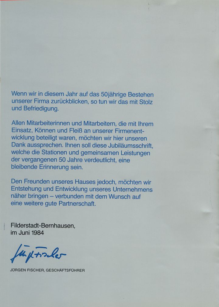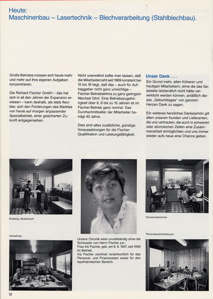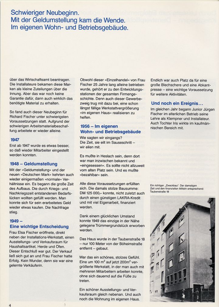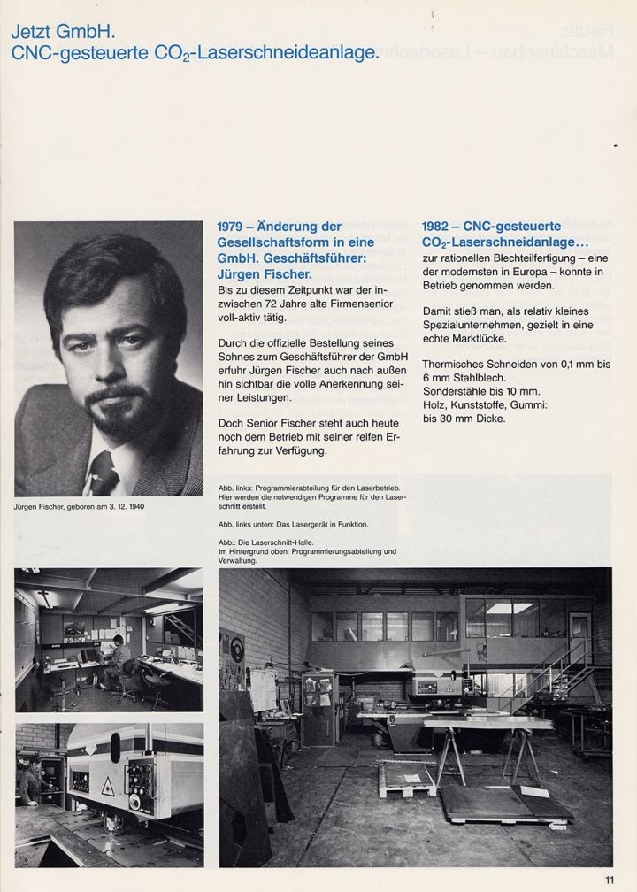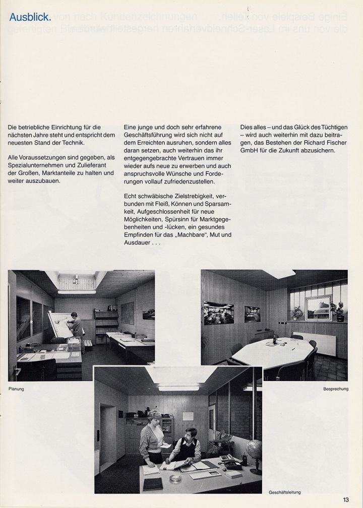 Im Jahr 1934 gründete Flaschnermeister Herr Richard Fischer (1907-1993) die Firma in Stuttgart Heslach. In den Anfangsjahren blieb Richard Fischer seinem erlernten Berufsbild treu. Nach einiger Zeit begann das noch junge Unternehmen auch klassische Blechteile zu produzieren - hauptsächlich für das Baugewerbe. In zweiter Generation wurde der Betrieb neu ausgerichtet und der Schwerpunkt in Richtung Industrie verlagert.