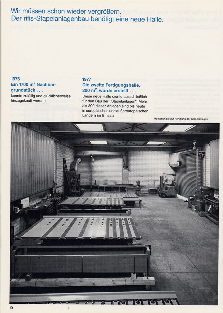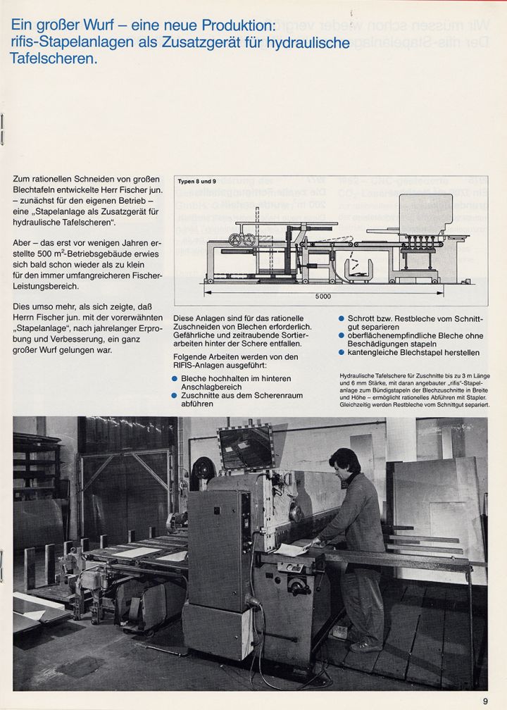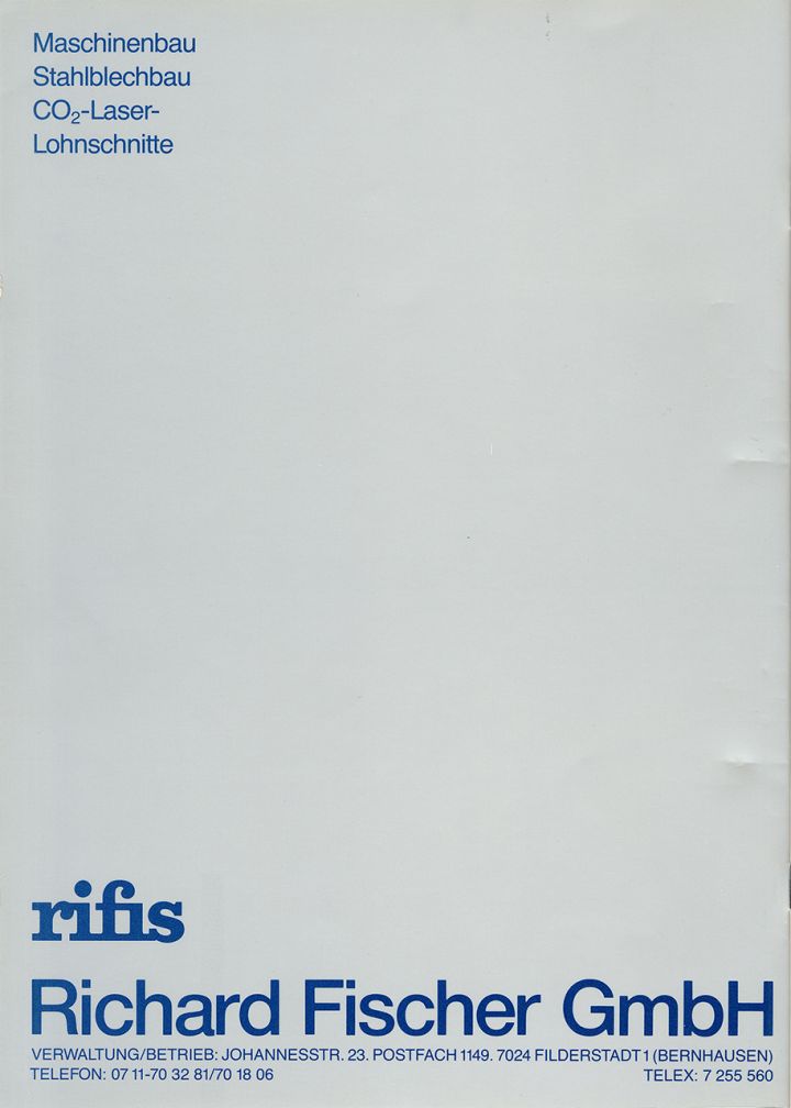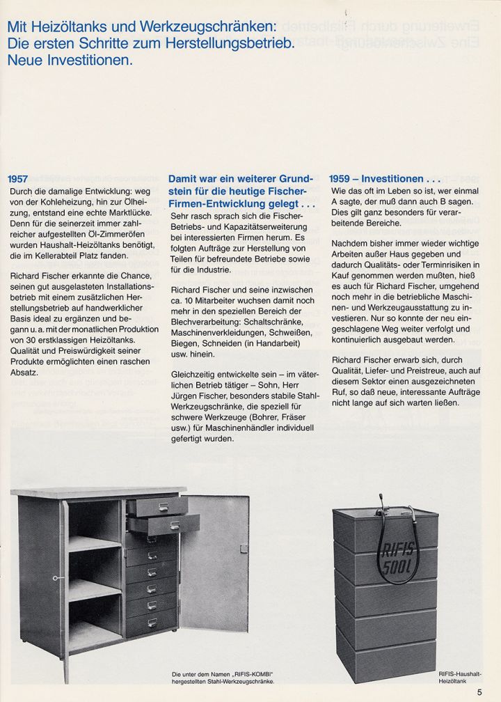 Das Unternehmen beginnt mit der Herstellung eigener Produkte. Haushaltsöltanks der Marke RIFIS und Werkzeugschränke werden produziert. In Filderstadt – Bernhausen wird 1969 eine neue Produktionshalle gebaut, die Firma zieht um. Der Firmenzweig Flaschnerei und Sanitäre Anlagen wird verkauft. Eine von Herr Jürgen Fischer patentierte Eigenentwicklung zum Abstapeln gescherter Blechzuschnitte (Markenzeichen: RIFIS – Stapelanlage) konnte in den 60er und 70er Jahren weltweit bis zu 400mal verkauft werden.
